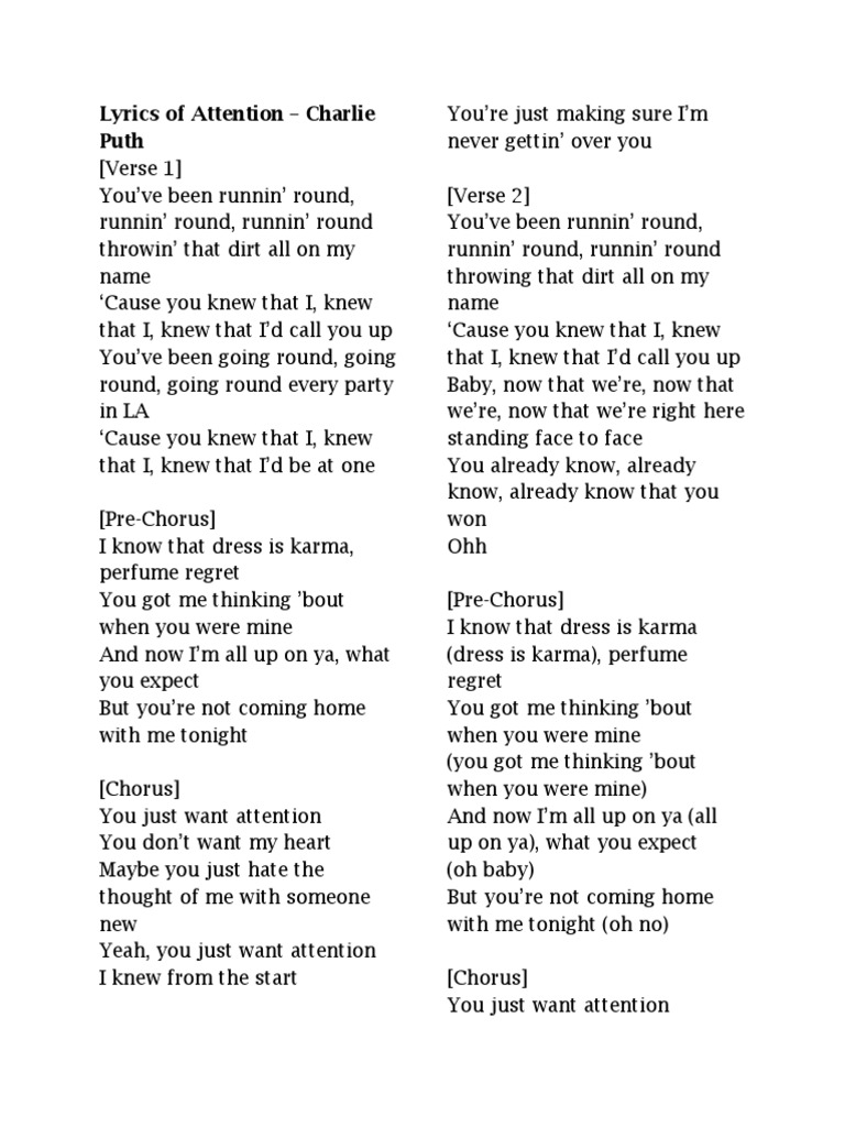 Lyrics Song Attention By Charlie Puth Esl Worksheet By Miriamo