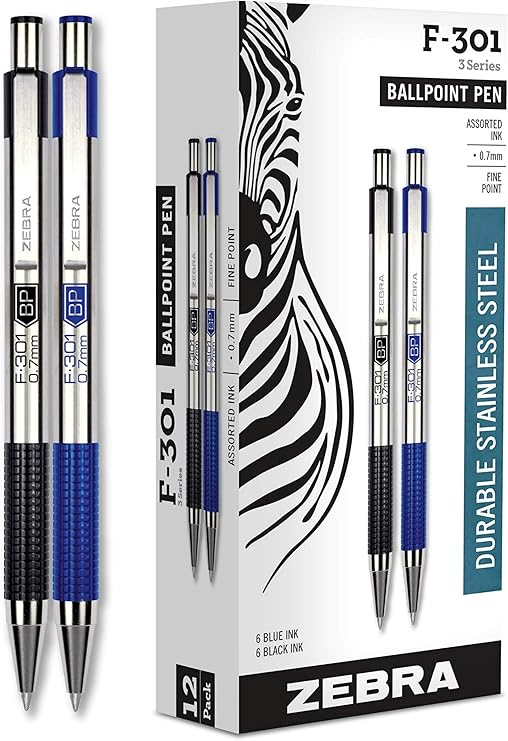 Amazon Com Zebra Pens Fine Point F 301 Bulk Combo Pack Of 6 Black Ink 6 Blue Ink Metal Pens Total Of 12 Pens Ballpoint Stainless Steel Retractable 0 7mm Fine Point