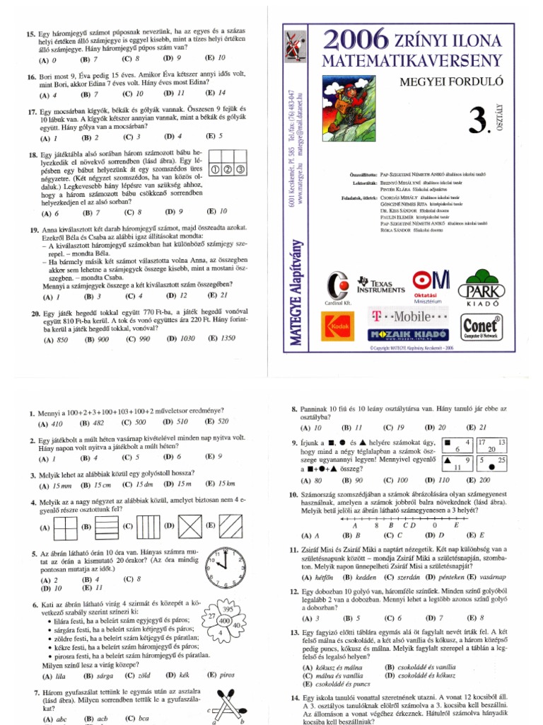Zrinyi Ilona Matematika Verseny Feladatai 3 Osztaly 2006